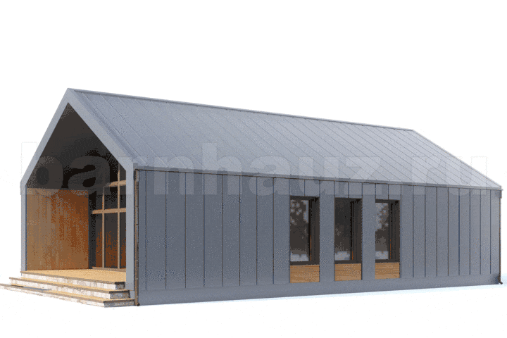 Одноэтажный дом в стиле Барнхаус площадь дома 85 кв. м. Панорамное остекление, терраса. Две спальни, кухня-гостиная, санузел, тамбур. Дом комфортно разместит семью из 2-4 человек.